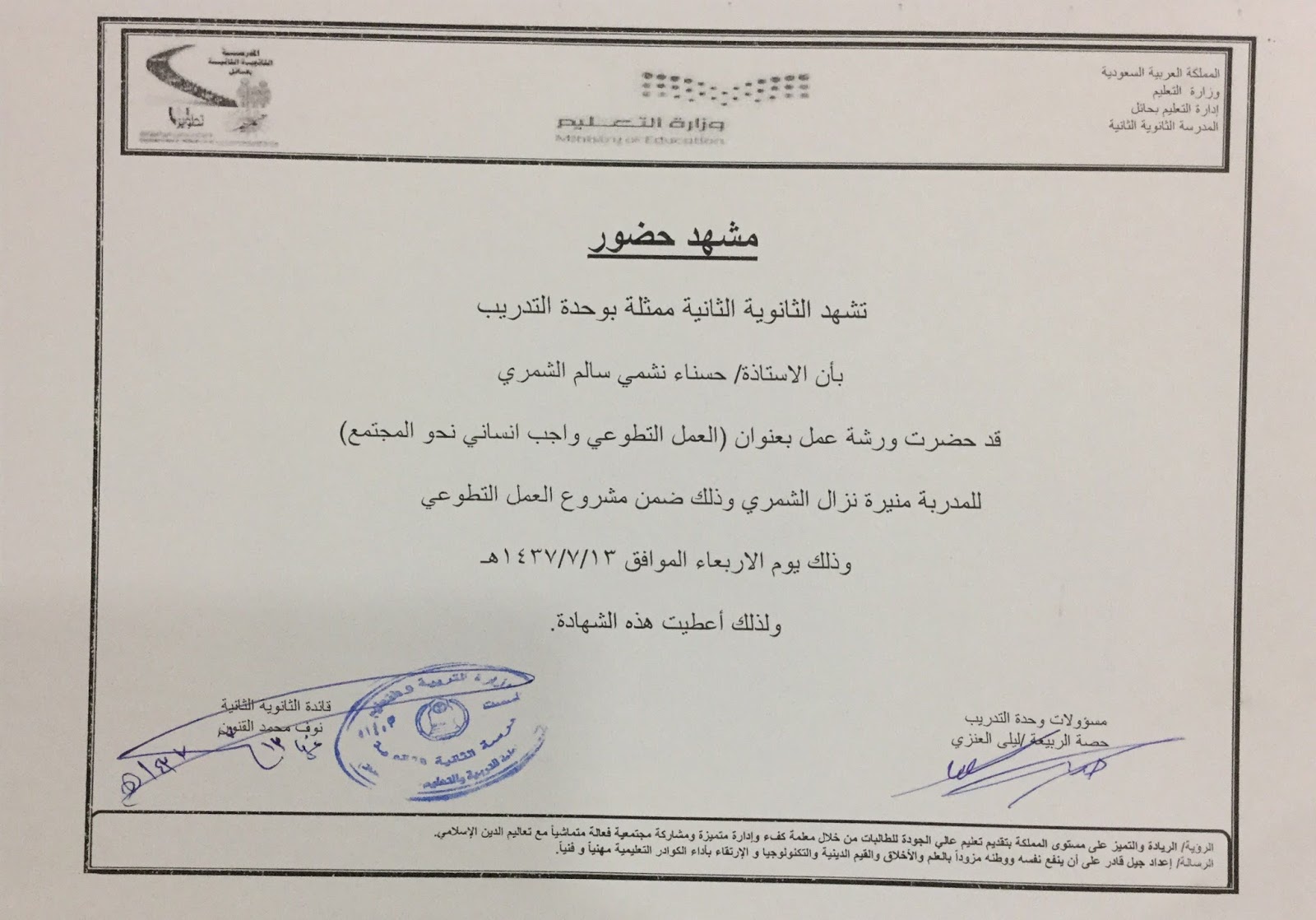 5 شهادات حضور الدورات ملف إنجاز المعلمة حليمه عبدالله